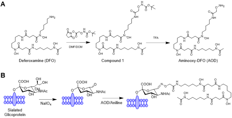 The efficient tracking of therapeutic cells in vivo using nuclear medicine technology has been hampered by the inability of current radiolabeling methods to incorporate PET and SPECT radionuclides into cells stably. In this project, I synthesized a series of aldehyde-reactive aminooxy-bifunctional chelators to enable conjugation and radiolabeling of cells for PET and SPECT tracking. The figure below shows the general procedure for our glycoconjugation of chelators. Our patented method has the potential to be implemented with a diversity of radiolabels and cell types, as well as with exosomes and other cell membrane derivatives.