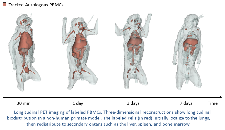 Cell therapies are increasingly recognized for their potential to transform cancer treatment, but their development has been hindered by the lack of tools to directly observe cell behavior in vivo. In this work, quantitative imaging methods are being developed to enable real-time tracking and dosimetry of therapeutic cells. Radiolabeling techniques are applied to visualize cell trafficking, persistence, and targeting through PET imaging, allowing data continuity between preclinical and clinical studies. Through these efforts, predictive image-based biomarkers are being generated to inform dosing, efficacy, and safety of emerging cell therapy products. The translation of this technology toward clinical and commercial use is being facilitated in collaboration with the Wisconsin Alumni Research Foundation (WARF) and industry partners.